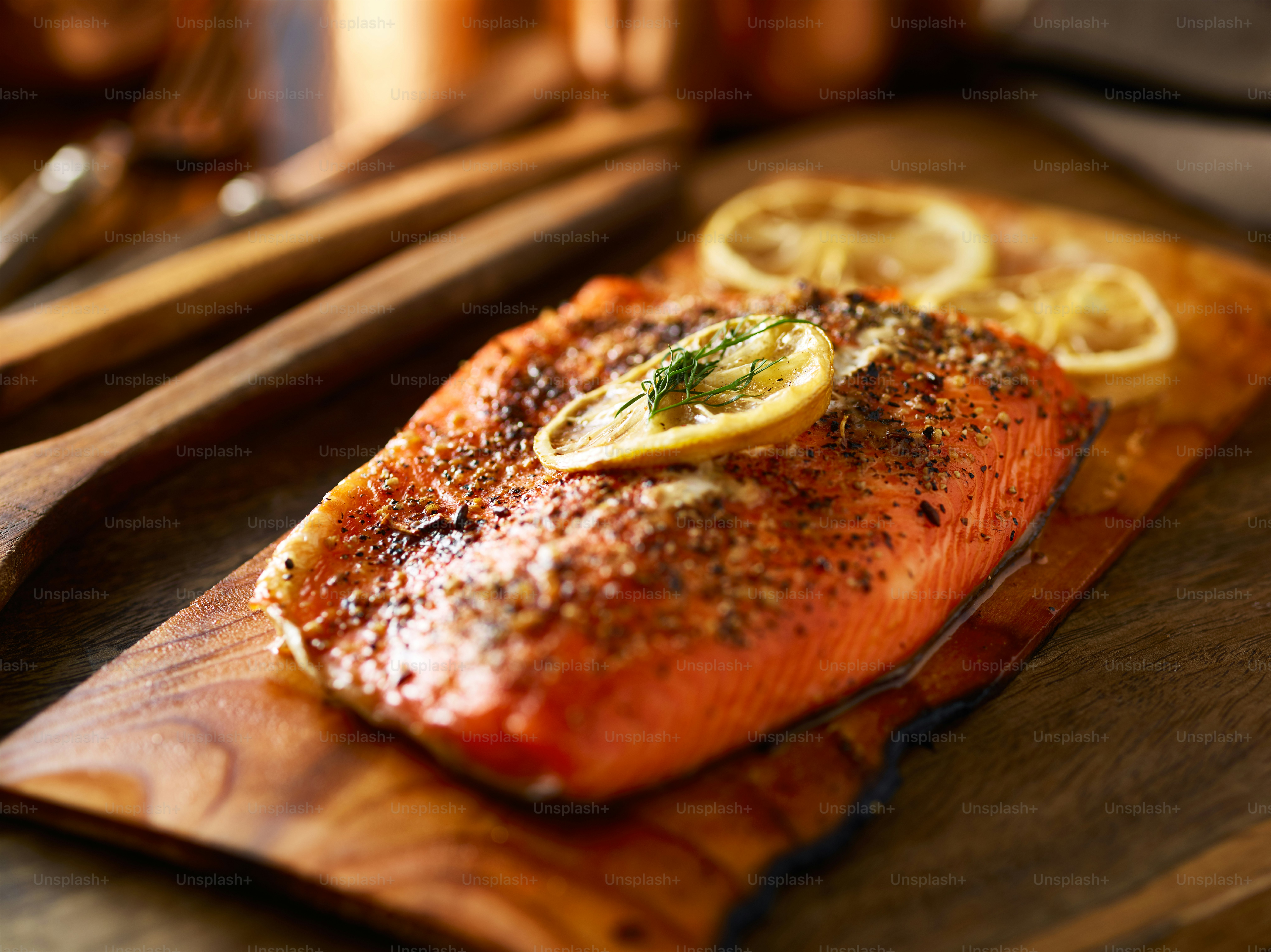 Cooked cedar planked salmon with lemon and dill cooling down and ready